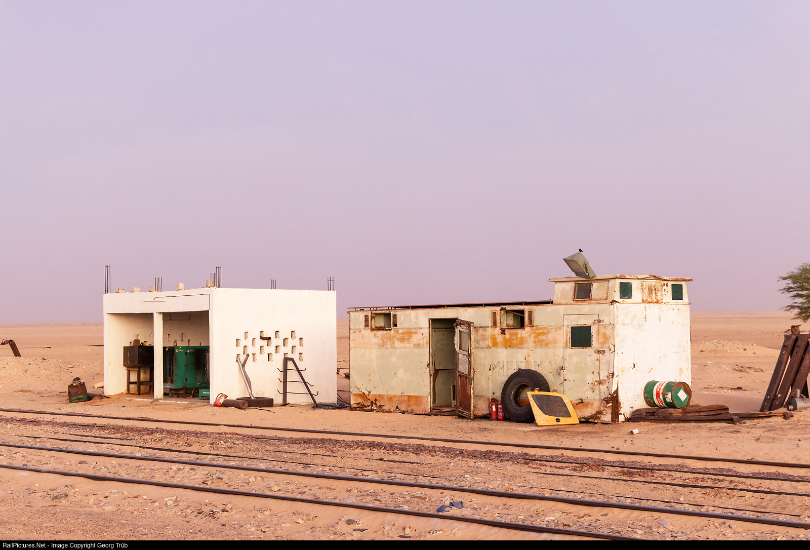 Disused railroad material is also sometimes reused in Mauritania. Here at Ben Amira station, the building on the right is made from a former MIFERMA freight train carriage. The building on the left houses a diesel engine with a generator to produce electricity.