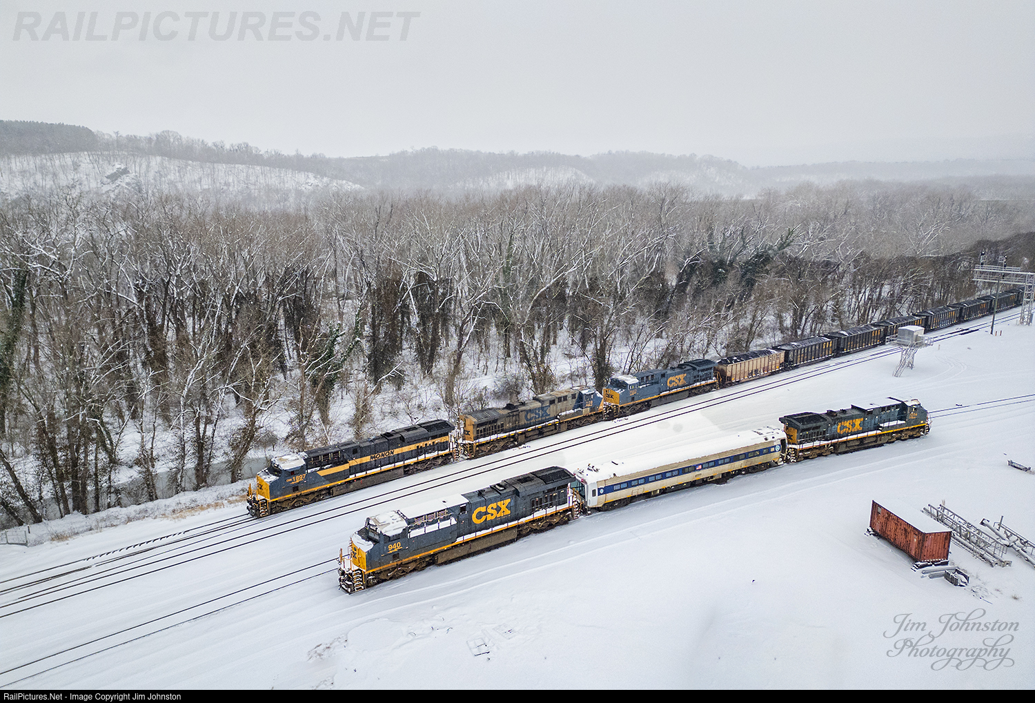 CSX "MONON" unit leads a loaded coal train toward Baltimore MD as a mid-Atlantic snowstorm begins to wind down. In the foreground is the DOTX216 FRA car on CSX W008.