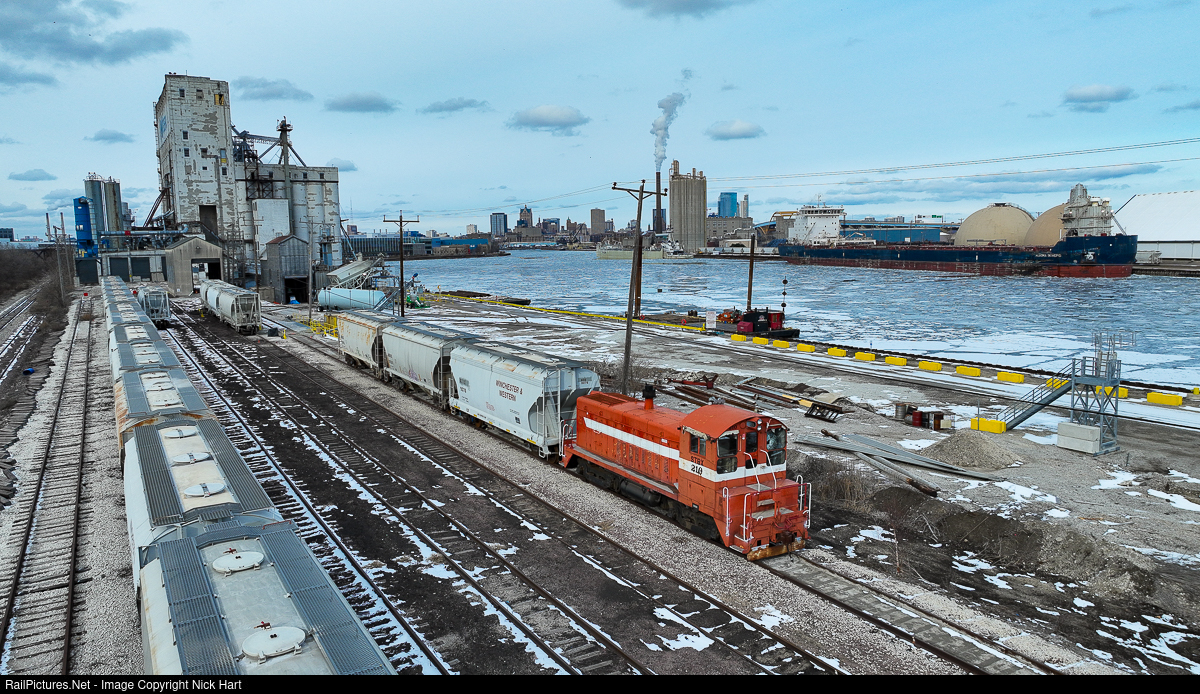 Rail n' Sail, Cream City Style! Sterling Bomba, LLC (STBX) SW8 #210 stands by at the Nidera Elevator in Milwaukee, awaiting its next call to duty. Meanwhile on the partially frozen Kinnickinnic River, Algoma Central's Algoma Intrepid prepares its departure for the Calumet River in Chicago. The 210 was built for the Colorado & Wyoming in 1952, while the Intrepid was built in 2020.