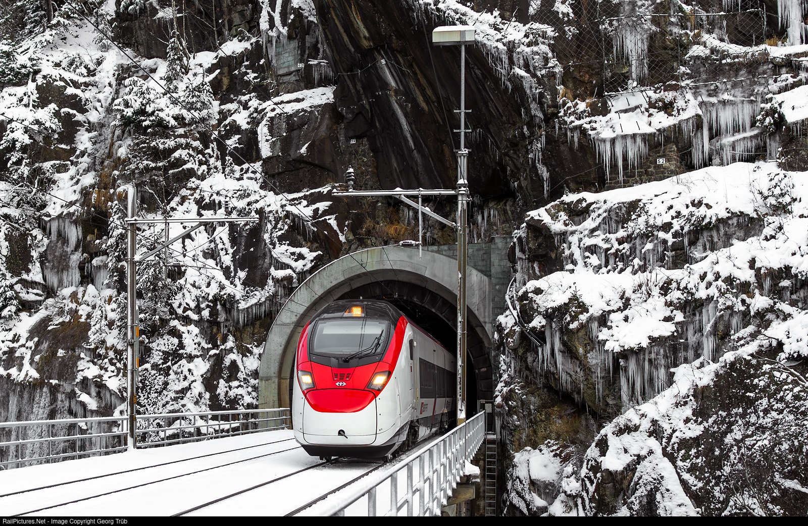 | Due to construction work in the Gotthard Base Tunnel, passenger trains will be rerouted via the Gotthard mountain route from January 13 to 25, 2025 and the base tunnel will be available for freight traffic without restriction. "Giruno" higspeed trains RABe 501 # 012 "Solothurn" and # 024 "Neuchâtel" of the SBB in multiple control are leaving the Leggistein loop tunnel and crossing the upper Meienreuss bridge between Wassen and Göschenen, running as Eurocity 10033 from Zürich via Milan to Venezia S.L. |