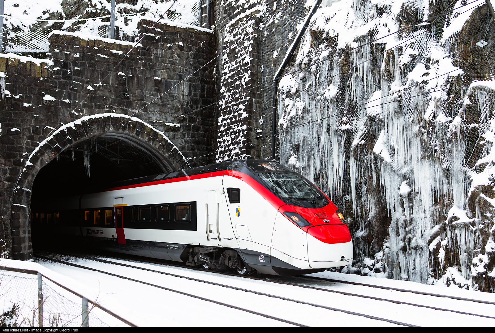 Due to construction work in the Gotthard Base Tunnel, passenger trains will be rerouted via the Gotthard mountain route from January 13 to 25, 2025 and the base tunnel will be available for freight traffic without restriction. "Giruno" higspeed trains RABe 501 # 008 "Monteceneri and # 031 "Liguria" of the SBB in multiple control are leaving the 78 meter long Meienkreuz tunnel between Göschenen and Wassen on the Gotthard north ramp, running as IC 10666 from Chiasso via Lugano-Bellinzona-Arth Goldau-Zug to Zürich.