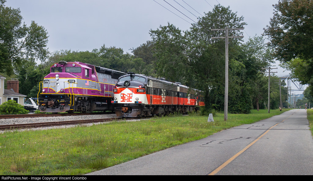 The Cape Flyer meets a Mass Coastal special at Sagamore in Bourne, MA. GP40MC 1138 and FL9M 2011 were both repainted that year. 2011 and 2026 are paired up to operate excursions for Railfan Day on the Cape Cod Central Railroad.