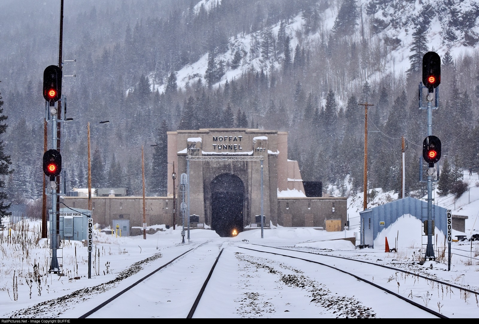 The red signals in a snowstorm forecast the BNSF Provo train, which is still deep in the Moffat Tunnel as it heads towards the east portal.