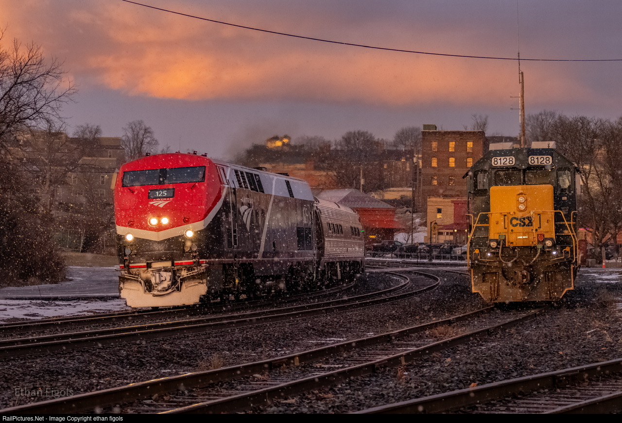 Just after sunset and at the tail end of a snow squall, Phase 7 P42 Amtrak 125 leads train 290 south out of Hudson as they pass CSX L022 who’s waiting to proceed north to Selkirk.