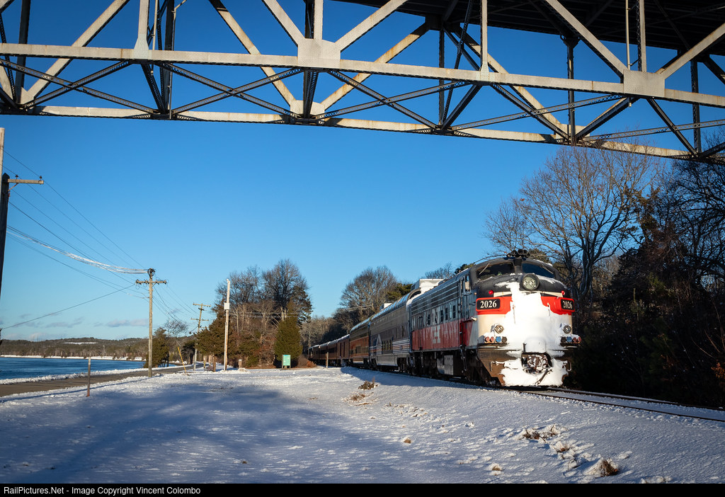 With a nice blanket of snow on the ground, Mass Coastal 2026 is seen stopped underneath the Bourne Bridge with equipment for a Valentine's Dinner Train put on by the Cape Cod Central Railroad.