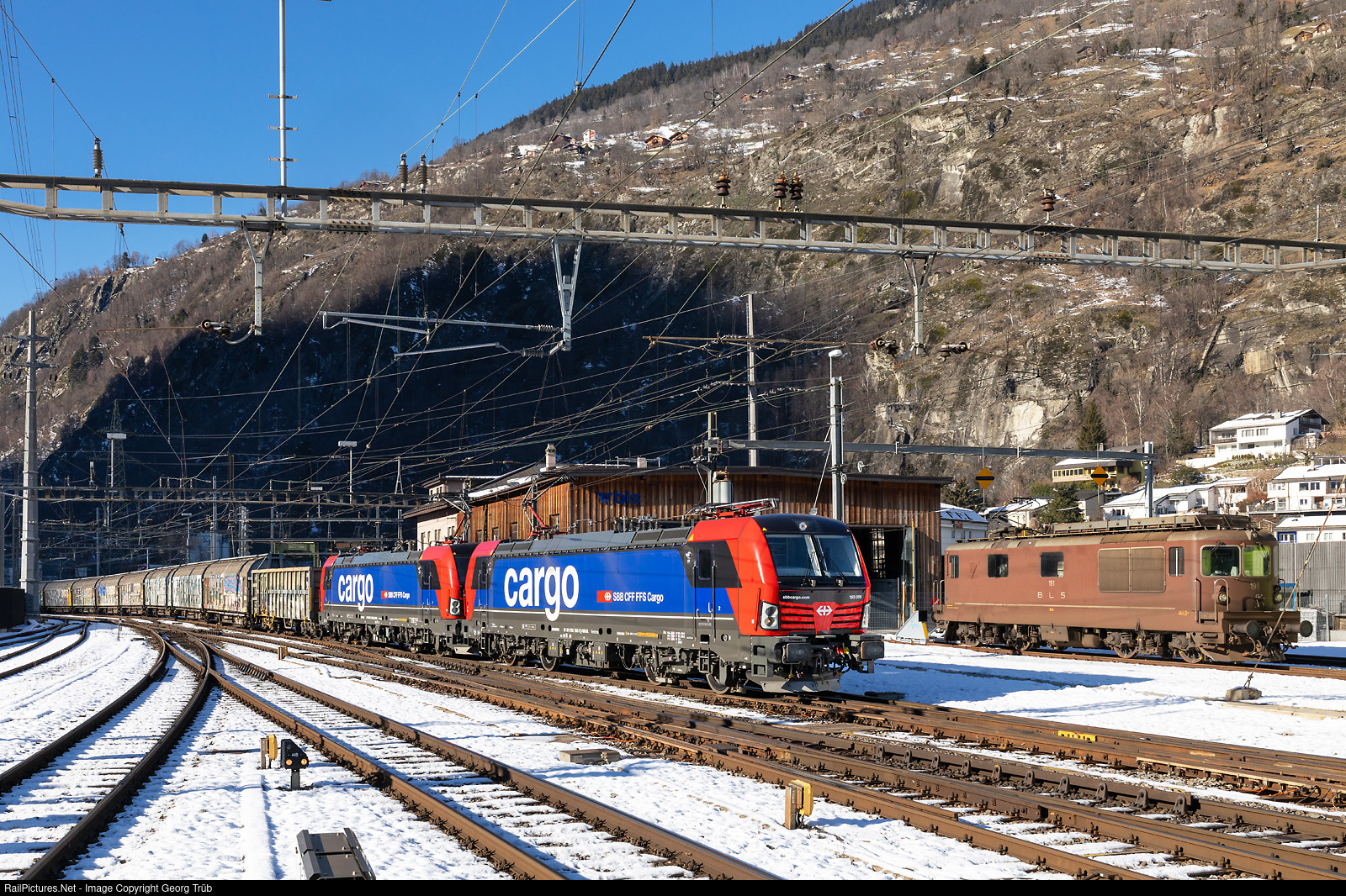 SBB Cargo leases 35 Siemens “Vectron” locomotives for 8 years from 2024 via the lessor NorthRail and financed by Bank Reichmuth in Lucerne. The first machines have now been in Switzerland for a few weeks and training of locomotive crews has begun at some locations. Scheduled freight trains are being hauled. The locomotive for 15000 V 16.7 Hz AC weighs 86 tons, has an output of 6400 kW and is licensed in Switzerland, Germany and Austria. In Switzerland, a maximum of 120 km/h is permitted according to train series A. 193 # 056 and # 058 in multiple control are entering Brig with the freight train 60023 from Lausanne shunting yard via Martigny-Sion-Brig-Thun-Olten to the Limmattal shunting yard. On the right is Re 4/4 # 191 of the BLS standing in front of the shed. This locomotive was built in 1982.