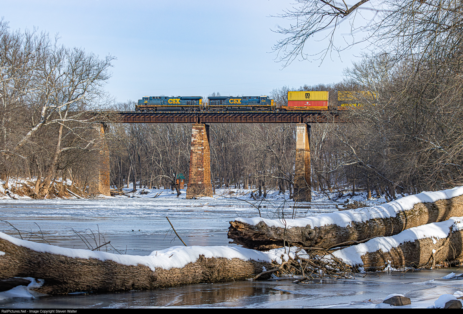 Westbound intermodal train I135 cruises over the frozen Monocacy River.