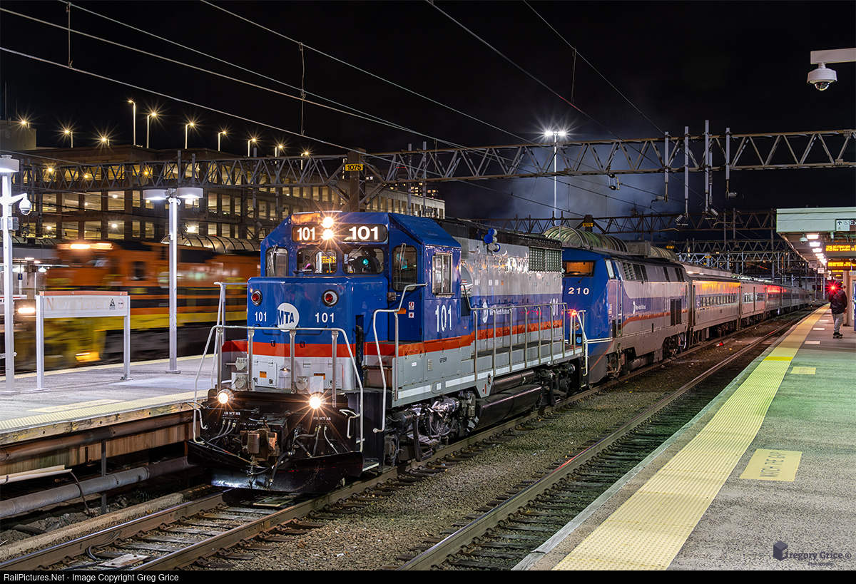On the night of November 24th, 2024, the Metro-North Railroad train 5559, with EMD GP35r 101, tows a disabled diesel trainset out of New Haven Union Station in Connecticut. P&W CHFP can be seen chugging along in the background.