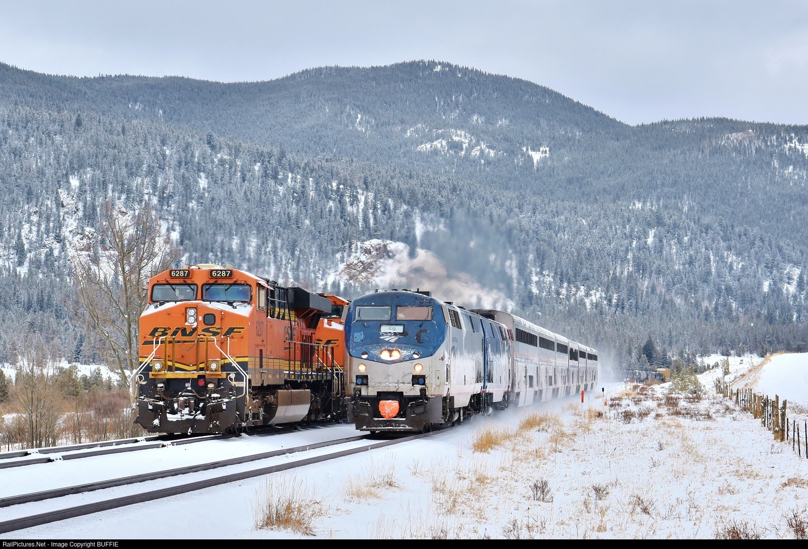 | Snow is falling on the Moffat Tunnel Sub as Amtrak engine #59 (P42DC) leads the Winter Park Express Ski Train past a BNSF train waiting on the siding at Tolland, Colorado.