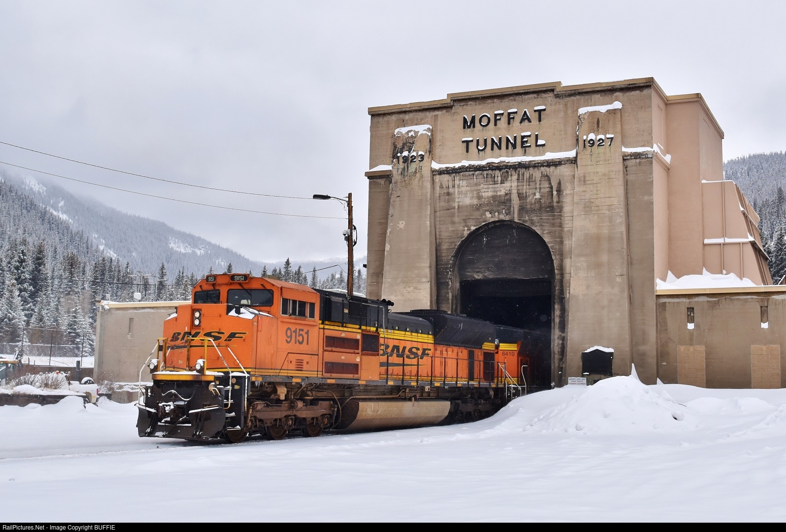 BNSF 9151 (SD70ACe) peaks out of the east portal of the Moffat Tunnel as it shoves the Denver to Provo train west on the Moffat Tunnel Sub.