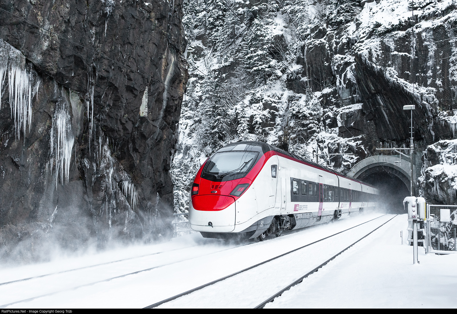 Due to construction work in the Gotthard Base Tunnel, passenger trains were rerouted via the Gotthard mountain route from January 13 to 25, 2025 and the base tunnel was available for freight traffic without restriction. "Giruno" highspeed trains RABe 501 # 008 "Monteceneri" and # 031 "Liguria" of the SBB in multiple control are crossing the Meienreuss gorge and enetering the Leggistein loop tunnel on the Gotthard north rampb between Göschenen and Wassen, running the IC 10066 from Chiasso-Bellinzona-Lugano to Zürich.