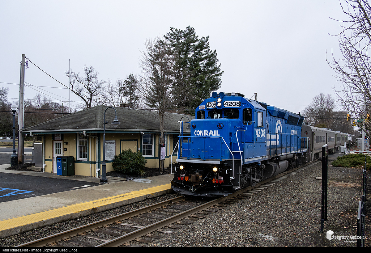 On the evening of January 19th, 2025, New Jersey Transit’s Conrail Heritage GP40PH-2B #4208, leads train 2111 into the last station stop on the Pascack Valley Line in New Jersey, Montvale.