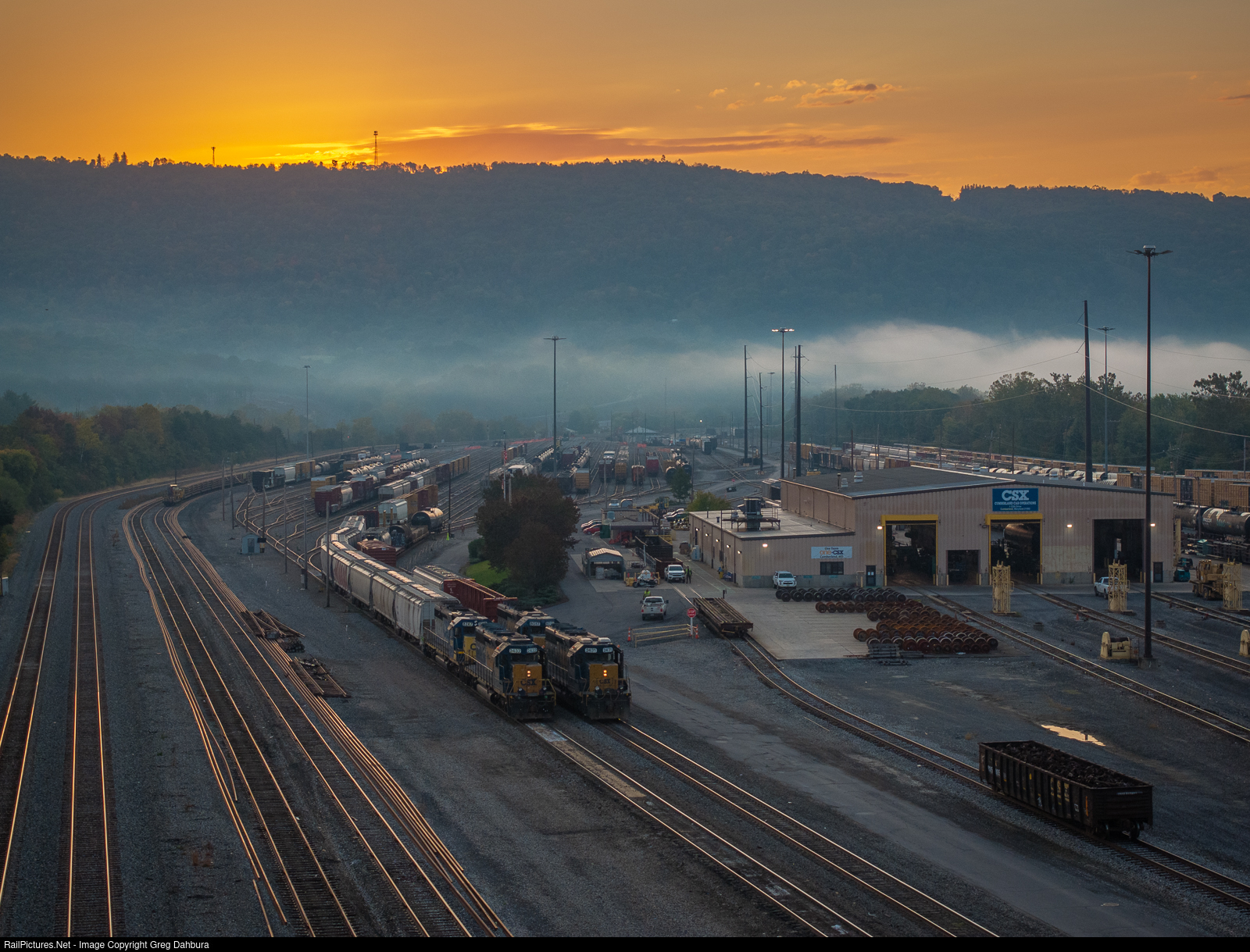 | As the sun rises over the mountains burning off an early morning fog, a pair of switching crews work simultaneously in the CSX Cumberland yard with classic EMD leaders. |