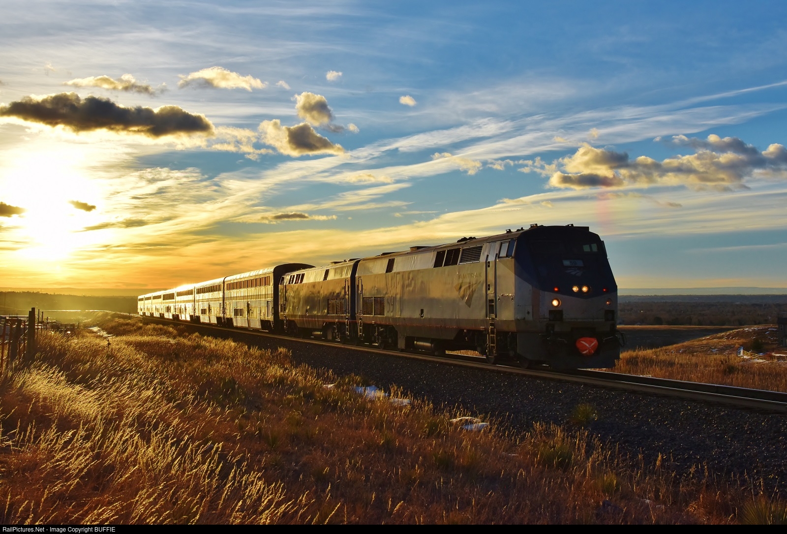| Amtrak engine #59 (P42DC) leads the Winter Park Express Ski Train through Leyden, Colorado as a golden sunrise glints off the side of the superliner cars.