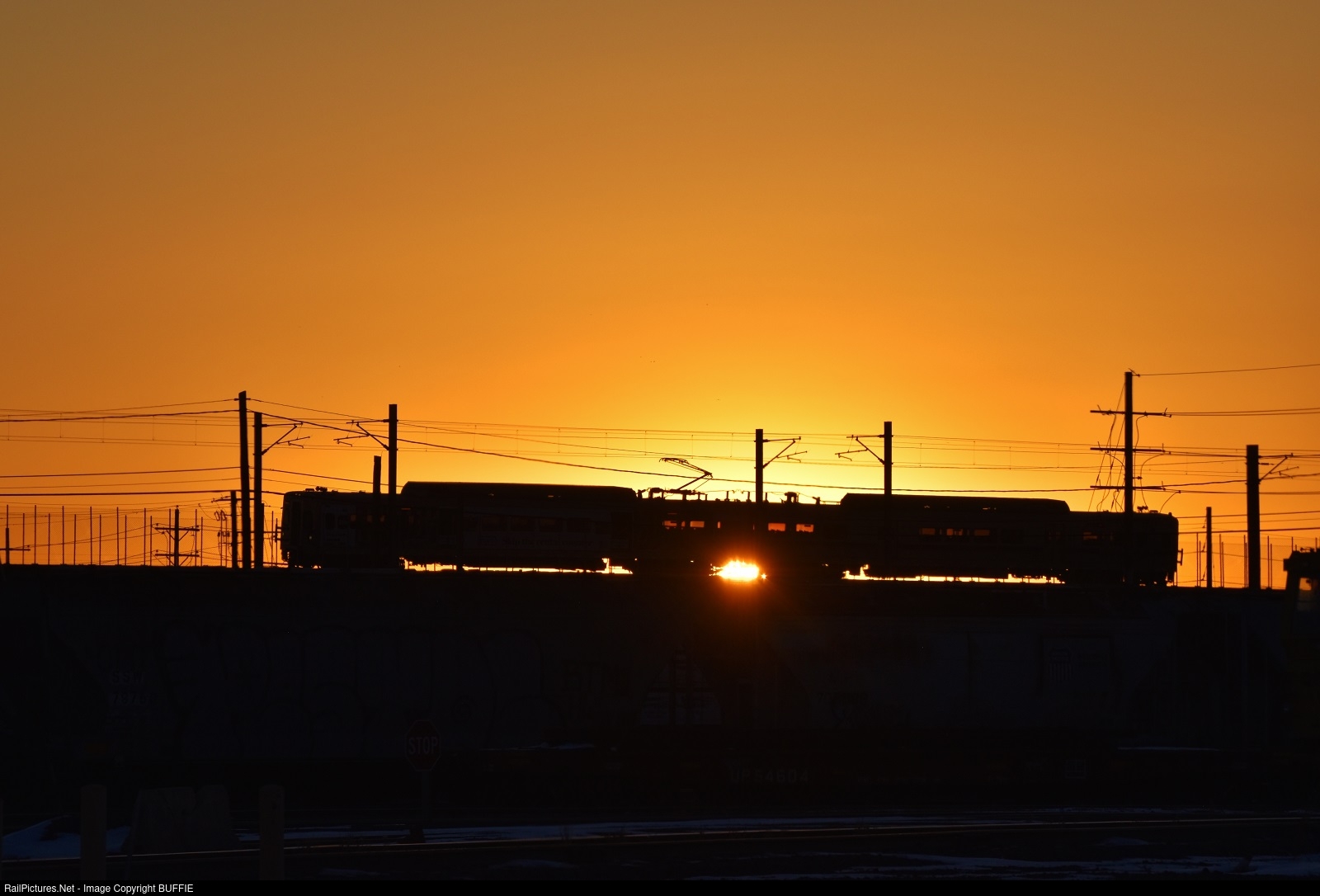 A Colorado sunrise catches RTD commuter train #4025 as it runs along the elevated track above the North Yard in Denver, Colorado.