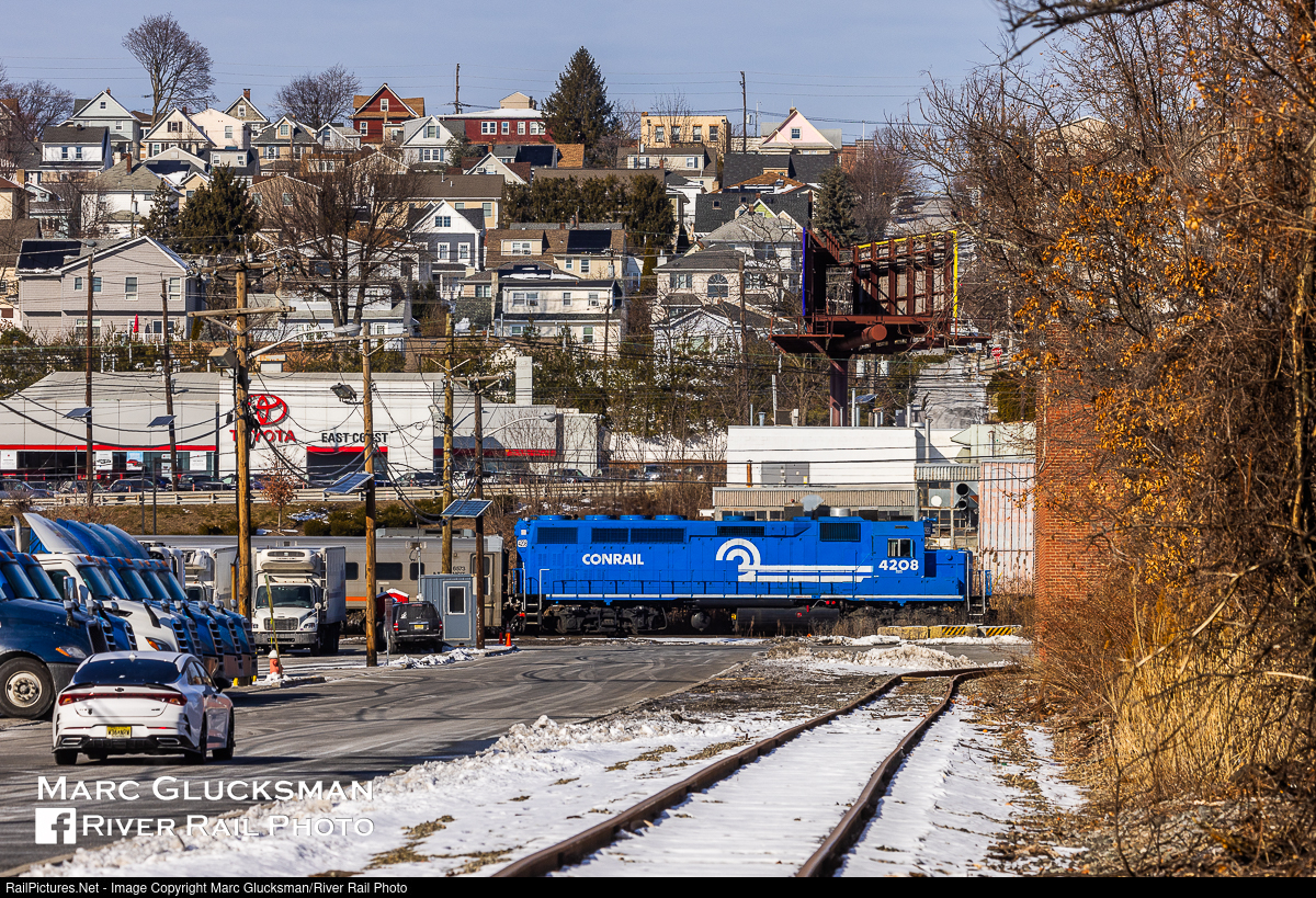 Sailing By Seamans. NJ Transit Train 2108 had New Jersey Transit's Conrail Heritage Unit, GP40PH-2B NJTR 4208 (ex-CR 3191, née-Penn Central 3191, EMD, GP40, 10/1968) for power on January 25, 2025 after a recent snowfall. The train is passing the "Seamans Lead" in the foreground, a spur leading to a cluster of freight customers in Wood-Ridge, New Jersey railroad east of the NJT Wood-Ridge Station next to Ethel Boulevard. This line was served by Conrail from 1976-1999 separate from its passenger business, and is still served by Norfolk Southern today on as a needed basis. In the background, the rising stacks of houses and businesses show the increasing elevation of the rest of the Borough from the low lying Meadowlands area.