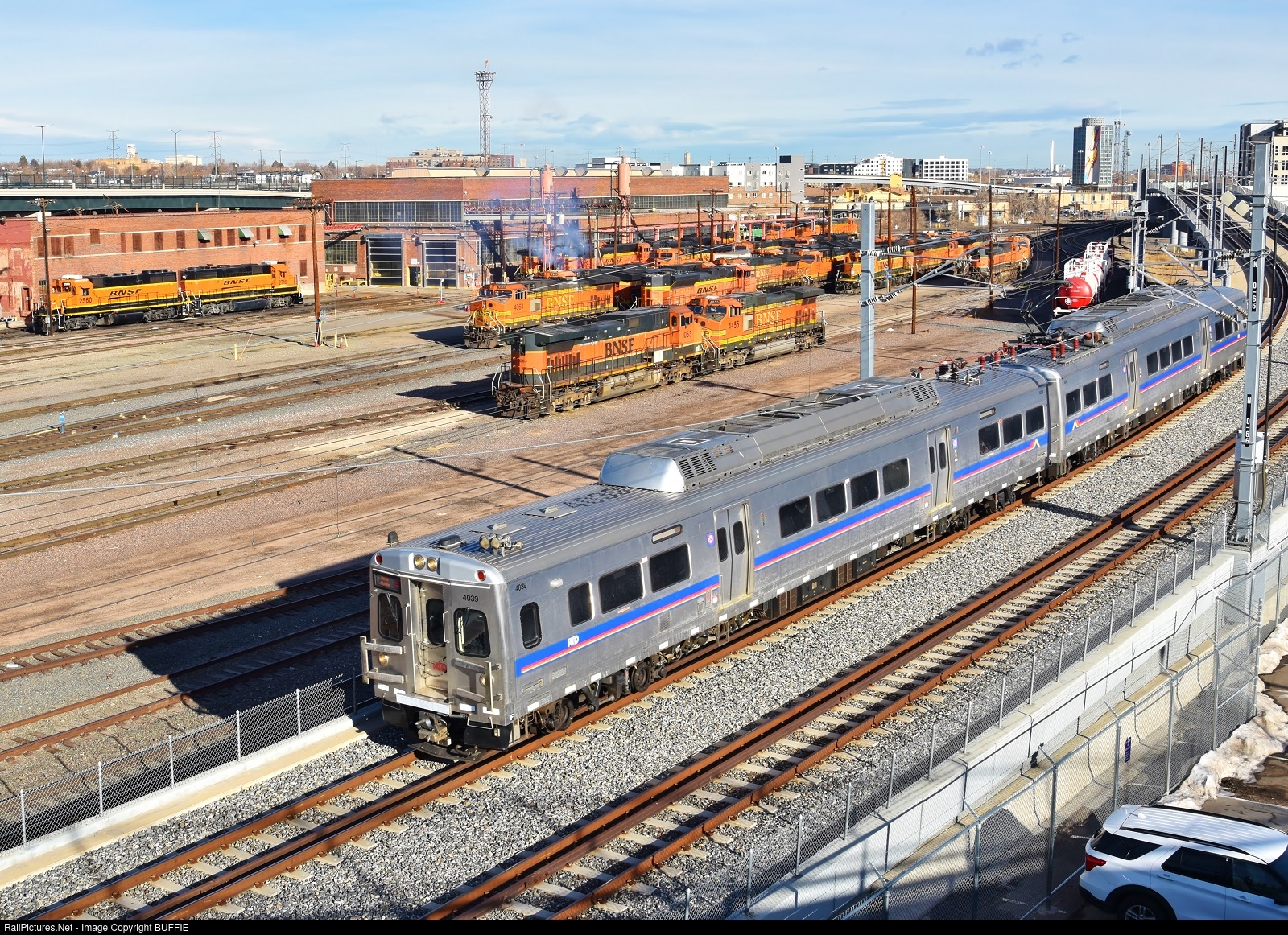 An RTD commuter train runs past the BNSF engine servicing facility in Denver, Colorado.