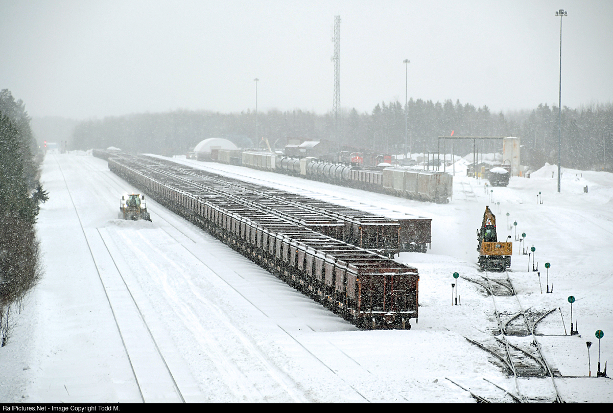 Snow clearing efforts taking place at CN's Keenan yard as some more snow falls. Lots of stored DMIR ore cars fill out a couple of tracks.