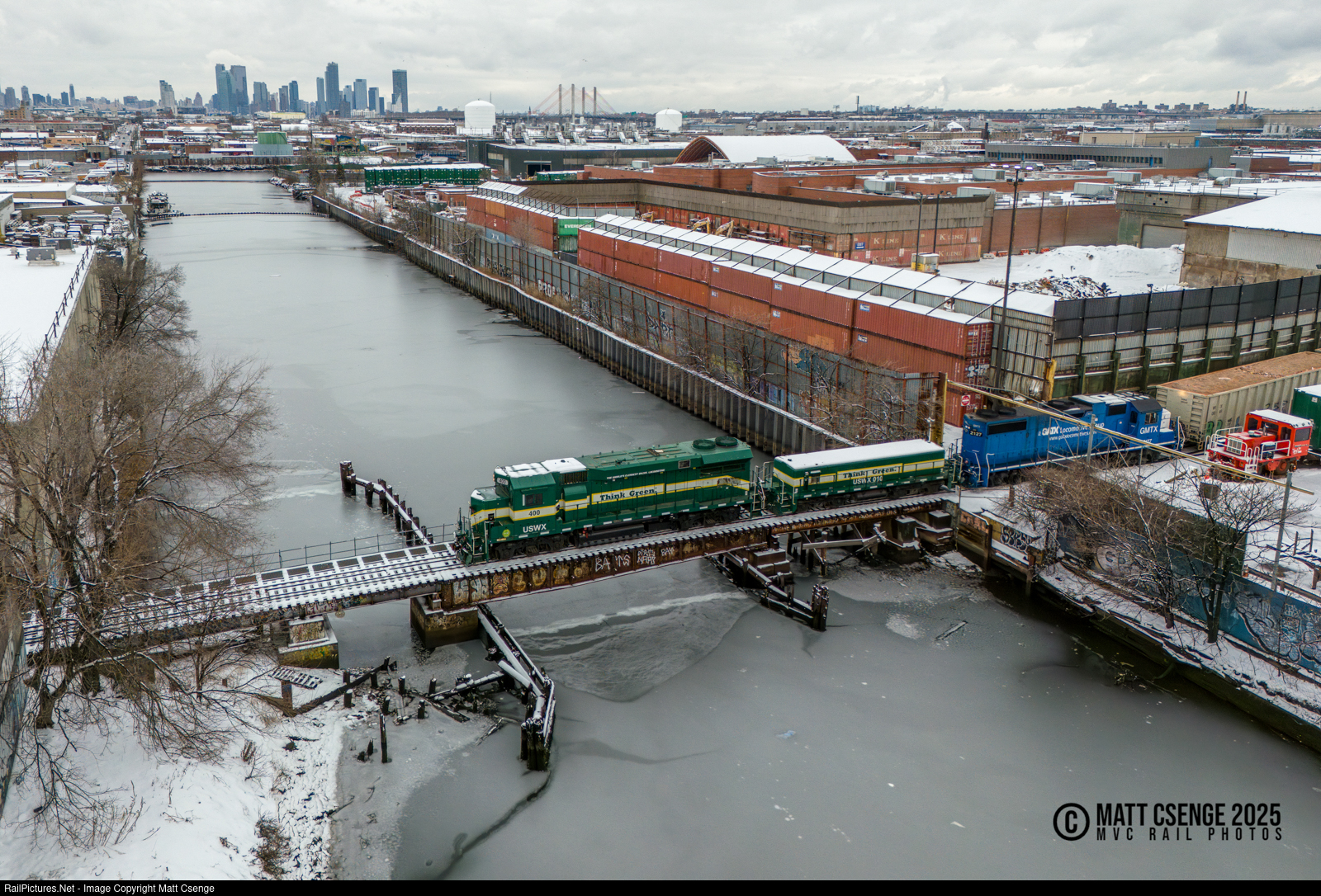 New York & Atlantic train RS-90 is seen easing out over English Kills as it switches cars at the recycling facility on the north side of the tracks. The power for the train on this day was USA Waste Services SE23B-M no. 400 and SE23B-S no. 010 leading, with leaser GP38-2 no. 2127 on the other end. The bridge was once a bobtail swing bridge that allowed passage of maritime traffic to the basin south of the railroad, but has been locked shut since the basin was filled in the 1950s. |