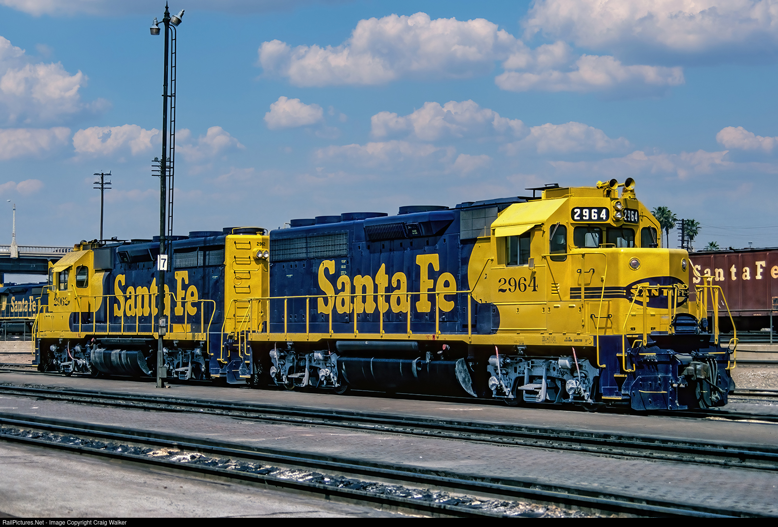 Coupled to ATSF 2964 is ATSF GP35 2962. This engine, too, is a former Toledo Peoria & Western engine. TP&W owned three non-dynamic GP35s, which rode on AAR trucks from trade-in ALCO diesels. After the Santa Fe acquired the TP&W, these three GP35s were rebuilt with dynamic brakes and Blomberg B trucks, and painted in the railway's Yellow Warbonnet paint scheme. TP&W 901 became ATSF 3463, and then ATSF 2962, as seen here. Today, it is BNSF Railway GP39-3R 2631.