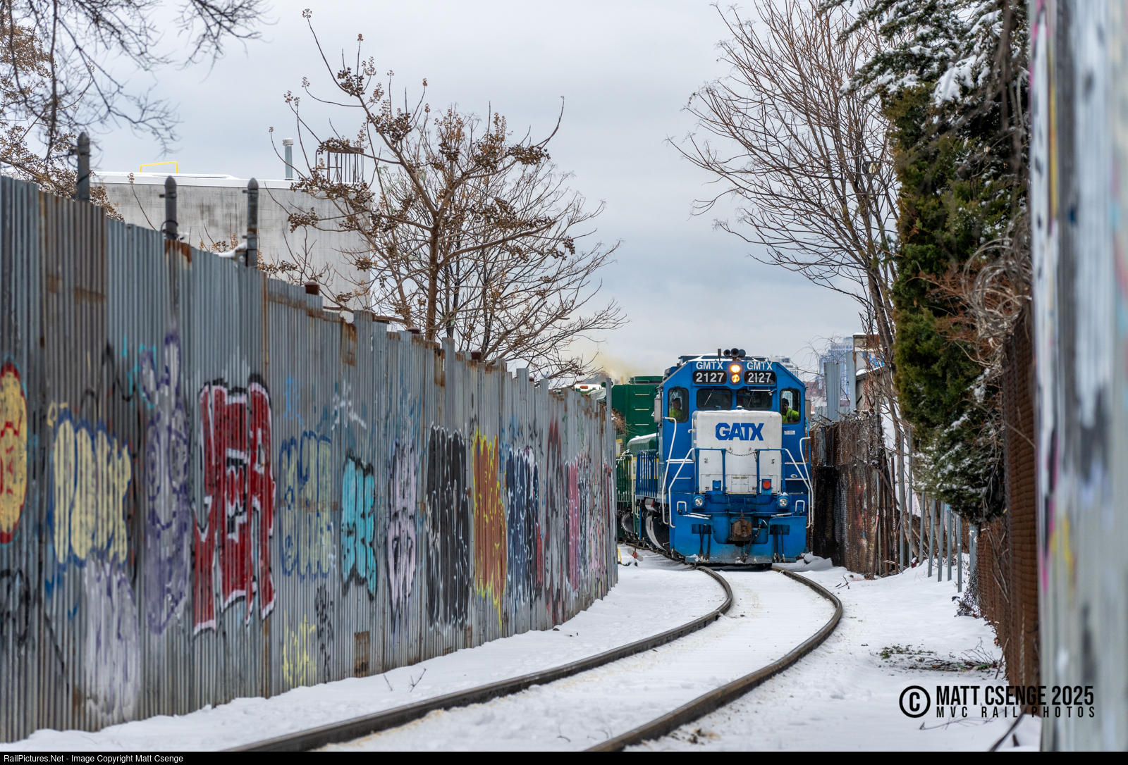 Leased GP38-2 no. 2127 is the lead locomotive on New York & Atlantic train RS-90 as it heads back east after serving customers on the LIRR Bushwick Branch.