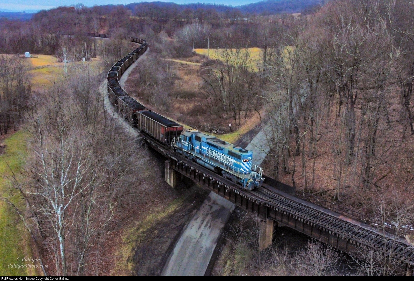 | Cumberland Mine Railroad SD38-2 1 crosses bridge 7 with thirty coal cars for unloading at the harbor. Cumberland Mine is not connected to the national rail network, owned privately by Iron Senergy. |