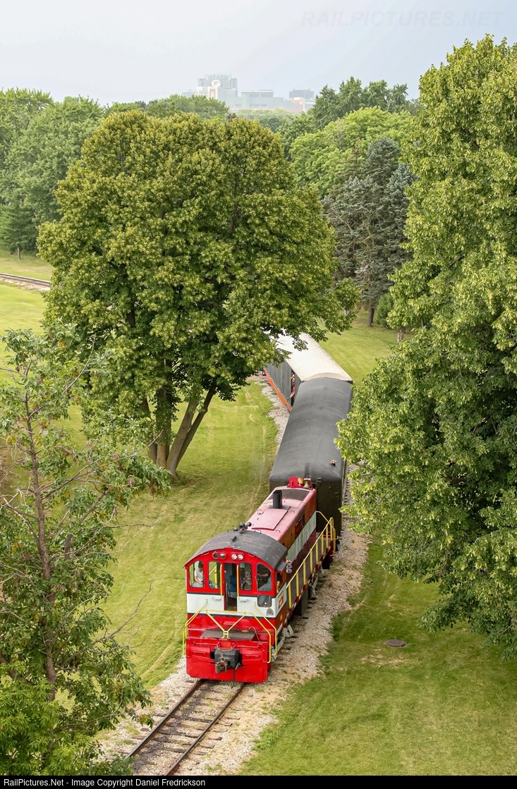 Southern Pacific Alco RS-6 switcher #1203, painted as Green Bay Route #106, pulls a small two car train of tourists around the loop track at the National Railroad Museum in the Green Bay suburb of Ashwaubenon, WI, with Lambeau Field visible in the background.