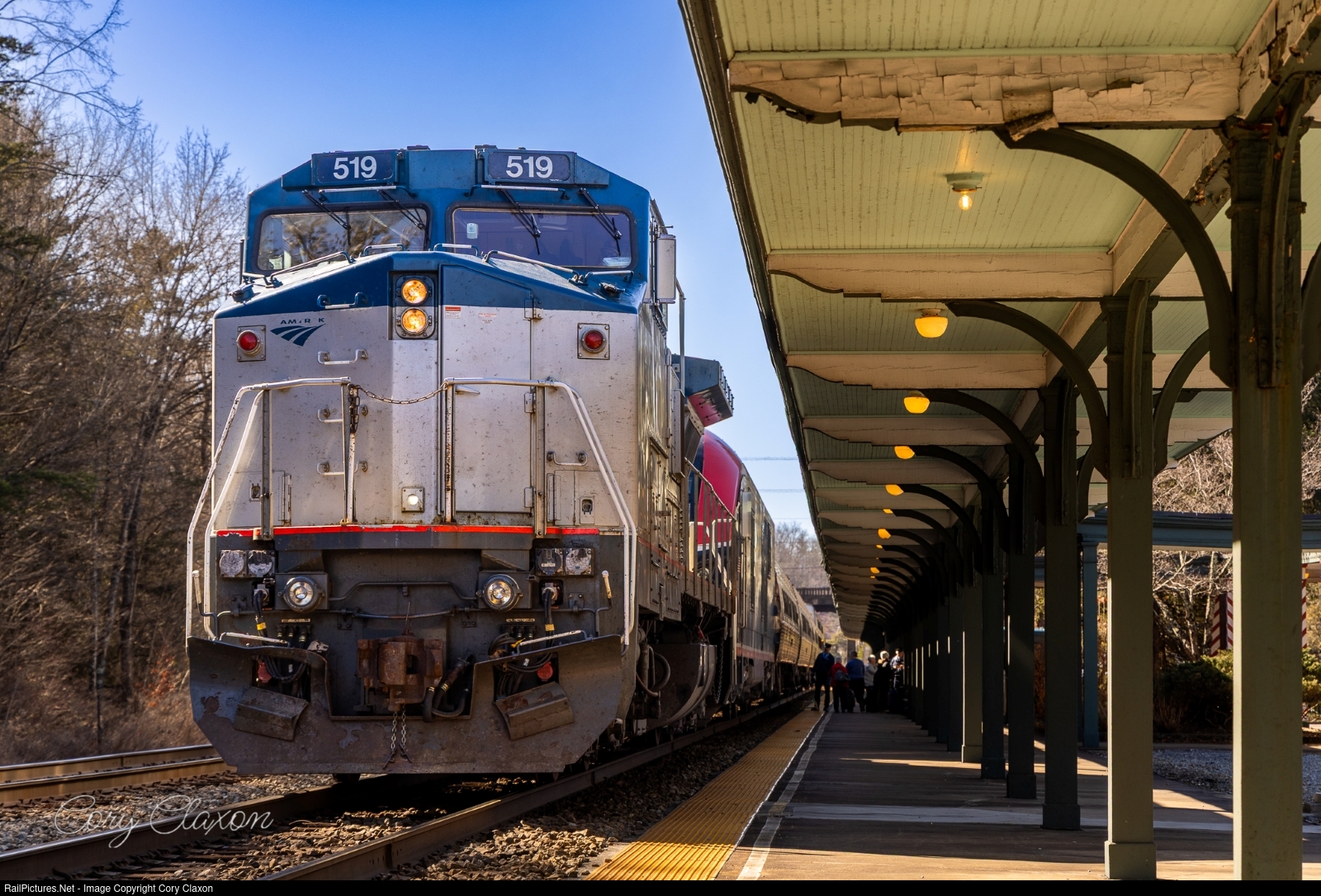 | An Amtrak Dash 8-32BWH makes a rare appearance on Train 50, the eastbound Cardinal. The Siemens Charger (trailing) had airbrake issues on the prior westbound run (2-5-25) and was terminated in Cincy and later towed by a CSX SD70MAC to Beach Grove in Indy. The trainset was turned there and 519 placed on the lead for the eastbound trip this date. Here, 519 glides to a smooth stop at White Sulphur Springs, home of the Greenbrier. A full railfanning trip report can be found on my website: https://coryclaxon.com |