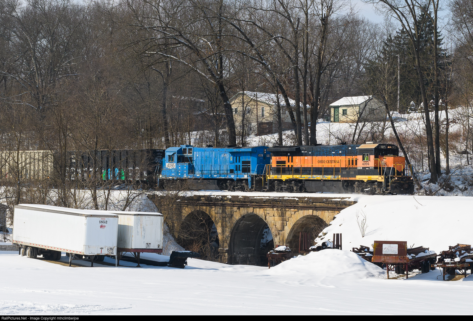 | The Ohio Central's ZVNL job makes its way north through South Zanesville, Ohio with a train of empty trash cars picked up from the Tunnel Hill Landfill. A pair of GE B23-S7 Super 7's lead the train as it crosses Shawnee Run on a stone arch bridge. |