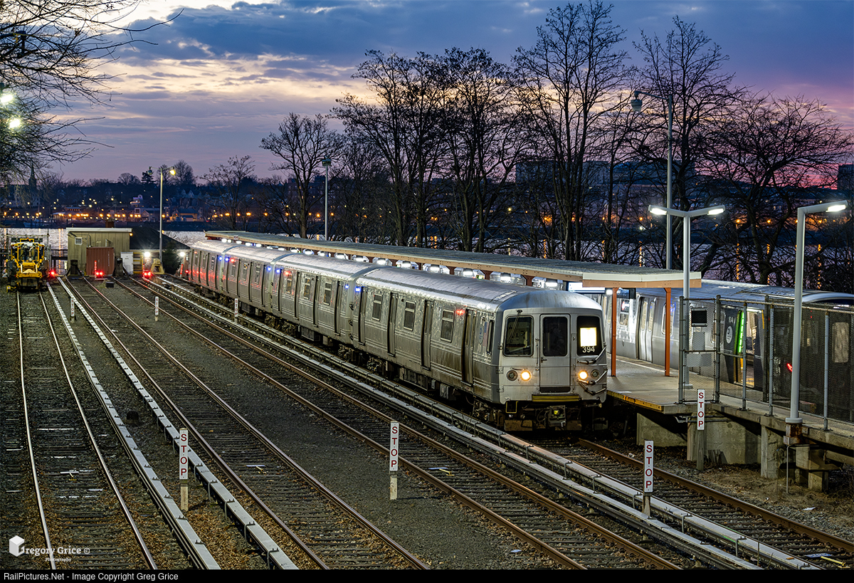 As the sun sets over Staten Island, a westbound MTA Staten Island Railway train, consisting of a 5-car St. Louis Car Company R44S set, prepares to depart the terminal at Tottenville on the evening of February 3rd, 2025.