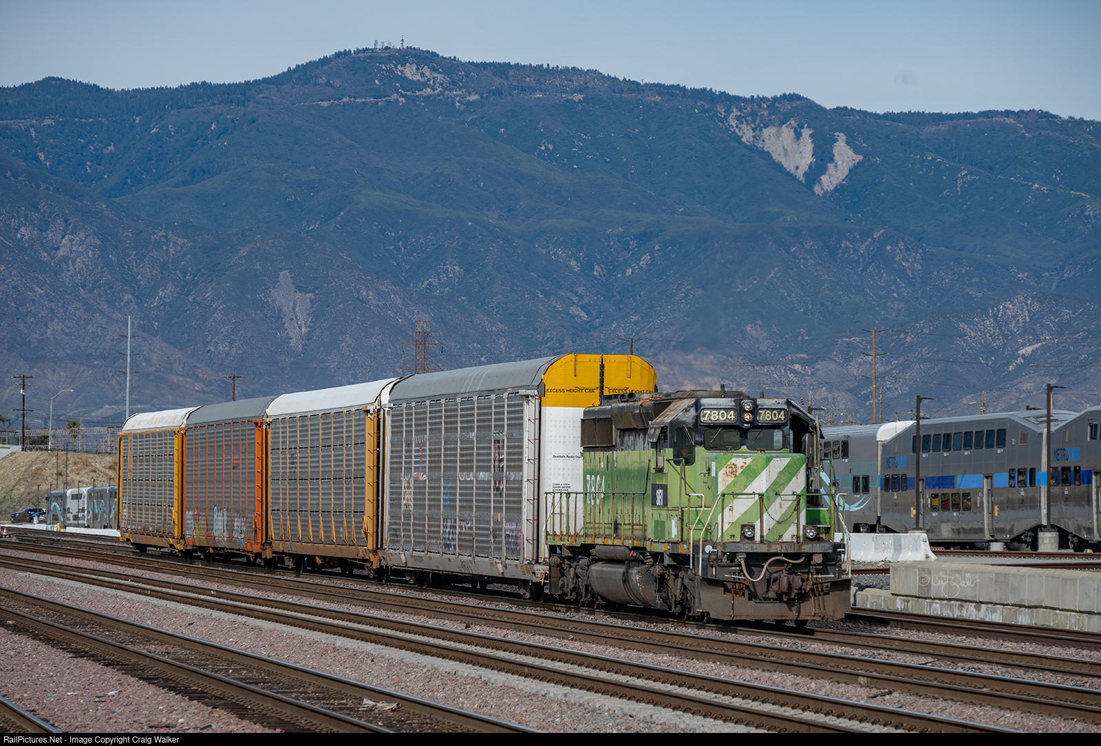 The automobile unloading facility adjacent to BNSF Railway's B Yard in San Bernardino is switched by a pair of former BNSF SD40-2s owned by Siemens Financial Services: 7801 (wearing BNSF's orange and green scheme, and 7804, still in its original Colorado & Southern BN Cascade Green and black scheme. SIFX 7804 was built by EMD in May 1977 as CS 934, later becoming Burlington Northern 7804, retaining that number after the Burlington Northern Santa Fe merger. (San Bernardino, California – February 16, 2025)