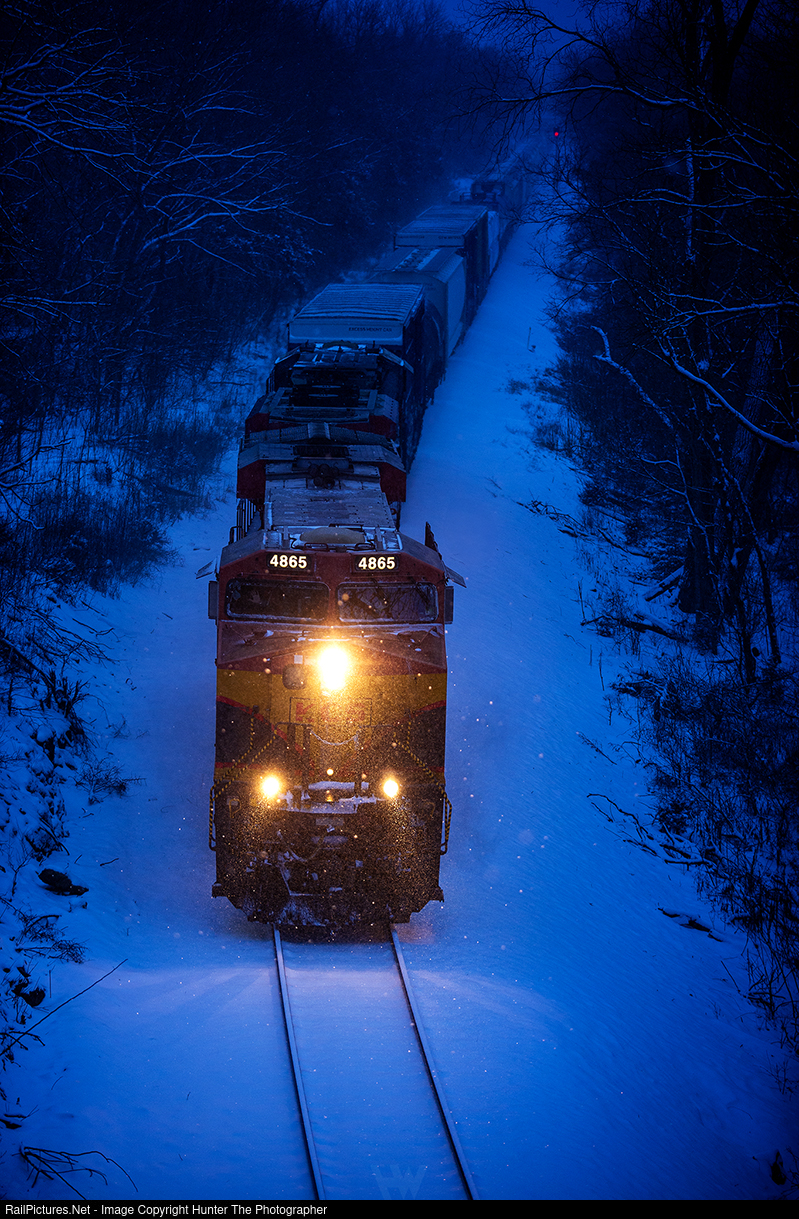 Niveous Nightfall | As the light fades on the evening of Tuesday, February 18, 2025, northbound CPKC manifest train M263 approaches the Missouri state line near Sulphur Springs, AR. Looking closely at the cab of the lead locomotive, the engineer can be seen giving a friendly wave.