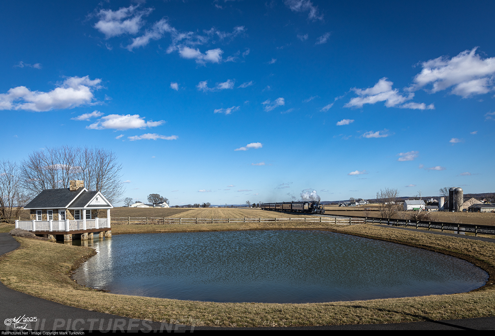 Strasburg Rail Road 89 rolls past the pond at Fairview on a windy February afternoon.