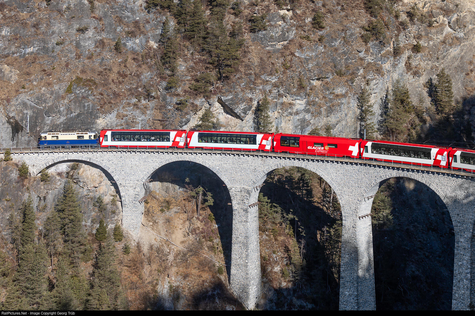 Ge 4/4 II # 626 "Malans" of the Rhaetian Railway, in the special ivory/cobalt blue paint scheme, pulls the PE 925 GLACIER EXPRESS St.Moritz-Zermatt over the 65 meter high Landwasser viaduct between Filisur and Alvaneu. The locomotive is in charge til Chur.