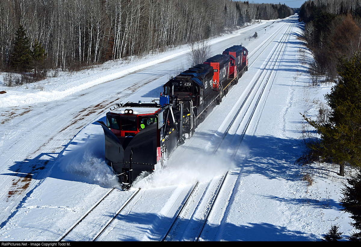 | CN 50936, a newly refurbished Jordan Spreader, is working the CN Keenan Sub with three IC SD40-3's pushing. They have cleared to the end of the line at Emmert and will now do the siding here at Wilpen.