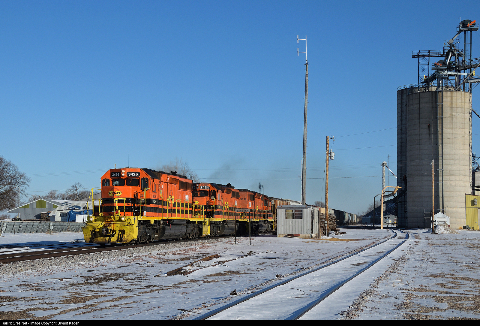| The tri-weekly RCPE train from Mankato, MN to Aurora, SD hustles through the small town of Sanborn, MN. |