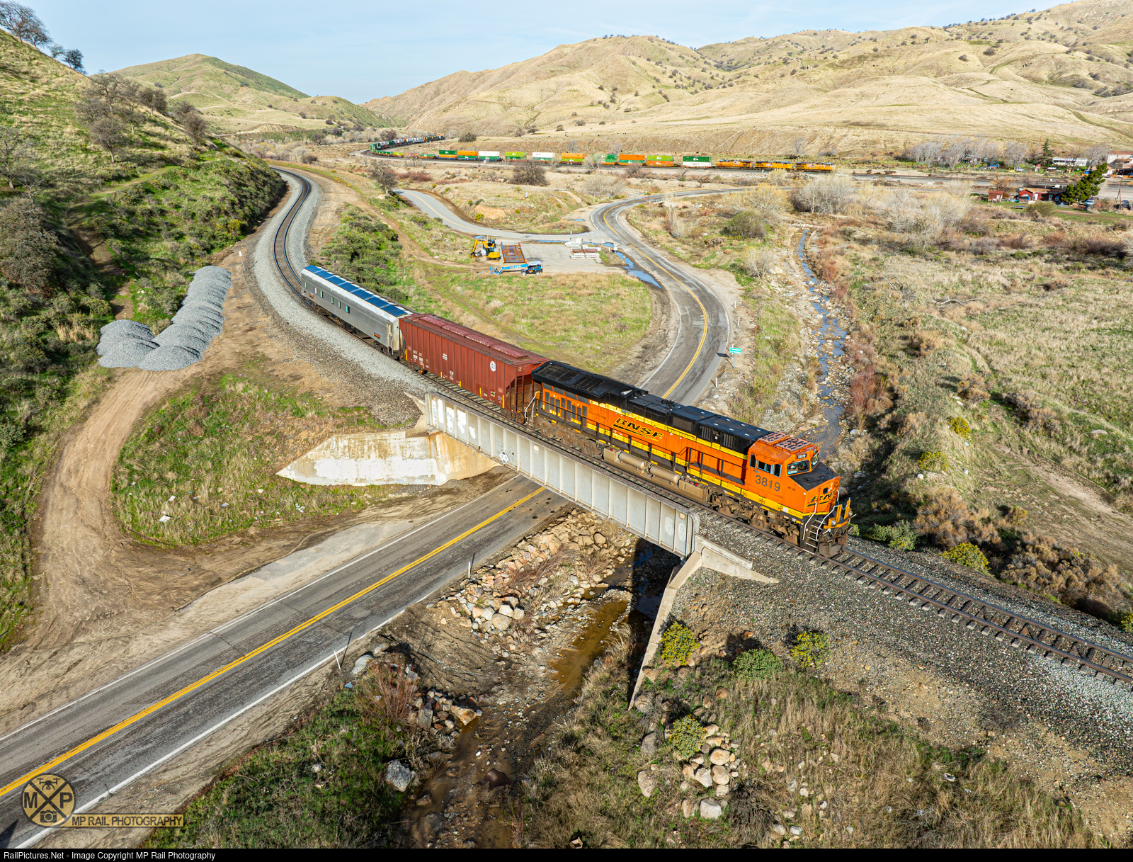 | A BNSF geometry train crosses the bridge over Bealville Rd as it heads northbound on the UP Mojave Subdivision. In the background a UP intermodal train can be seen waiting to depart onto the single track to climb toward the Tehachapi Loop. |