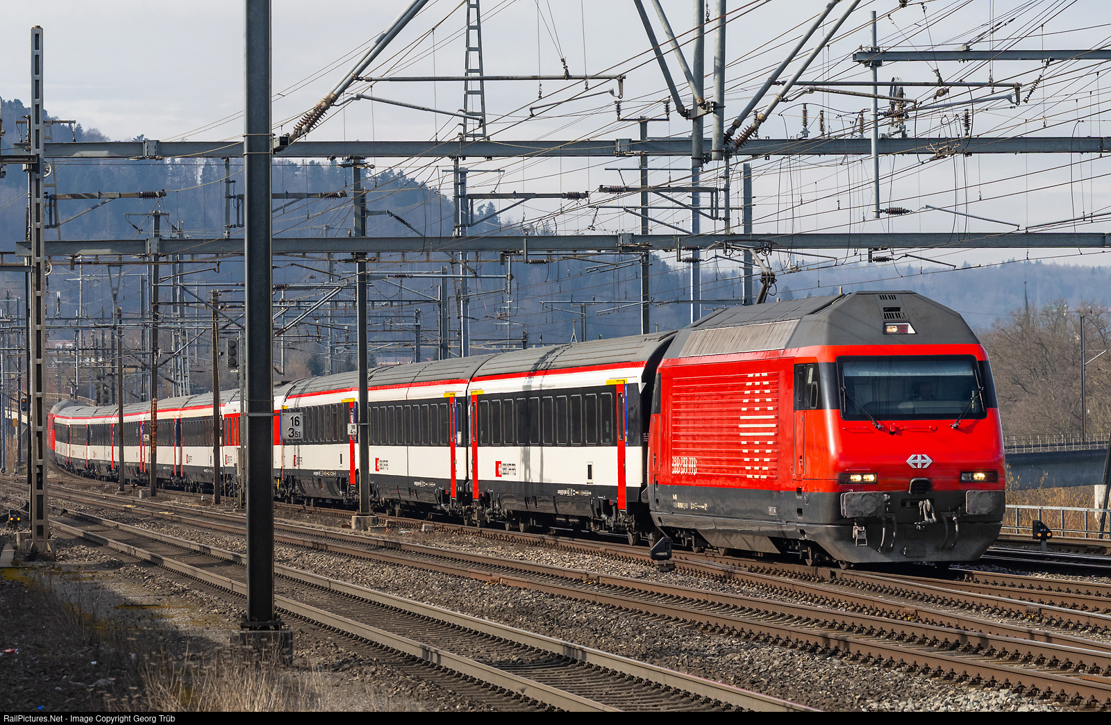 IC 773 of the line IC3 from Basel via Zürich-Sargans-Landquart to Chur is running through Killwangen-Spreitenbach at about 140 km/h. This is a push-pull train with Re 460 # 109 in front and Re 460 # 115 in the rear, and standard cars type IV and "Eurocity" cars in between, 3 first class, a WR dining car and 6 second class. The cars, with exception of the dining car, have all the new paint scheme with a red line along the roof edge and the doors all red. In Killwangen-Spreitenbach the passenger trains follow one another in a 2 minutes gap as on many busy lines on the SBB network.