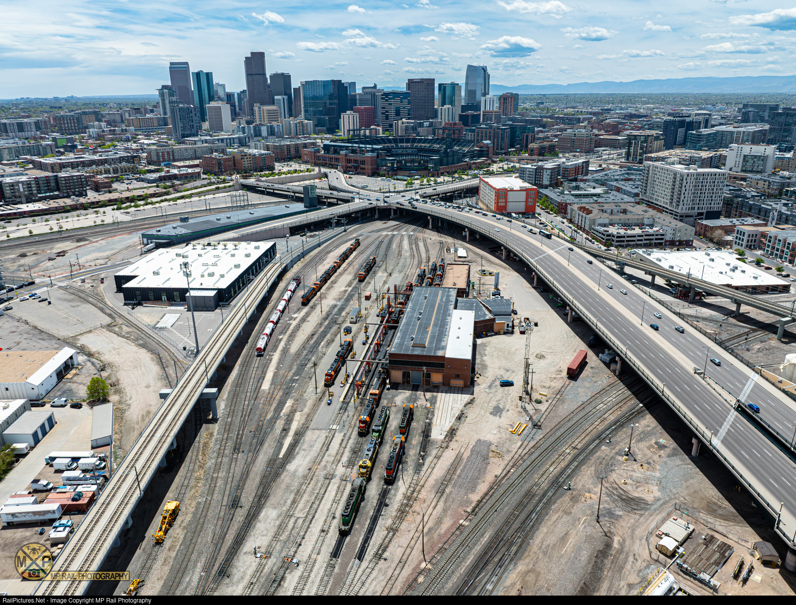 | With the city's skyline and Coors Field in the background, the BNSF engine facility in Denver has a mix of both yard and road power waiting to work. |