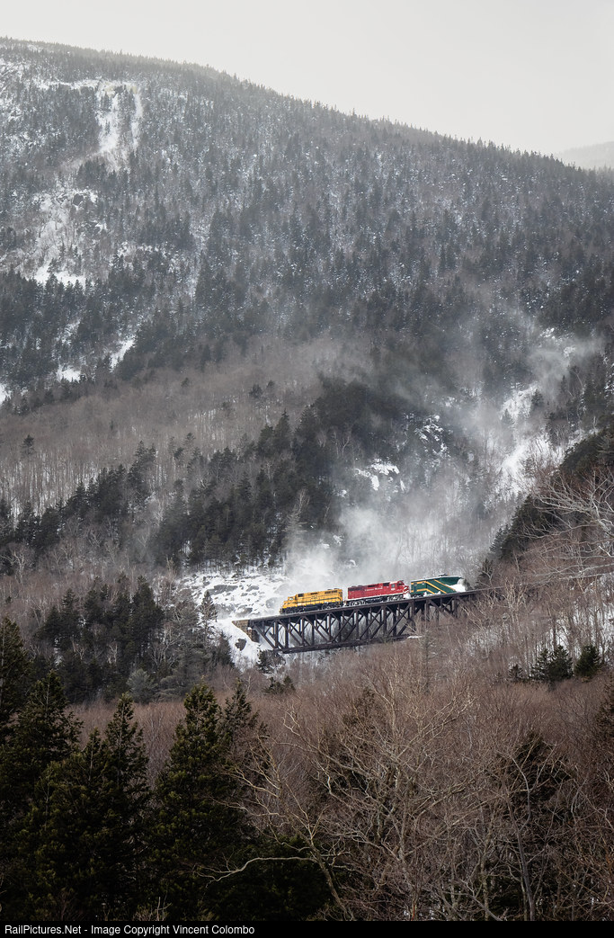 | A Conway Scenic snowplow extra crosses Willey Brook in Hart's Location, NH on the former MEC Mountain Division. Behind the snow plow is 255 and 252, both former MEC GP38s. |
