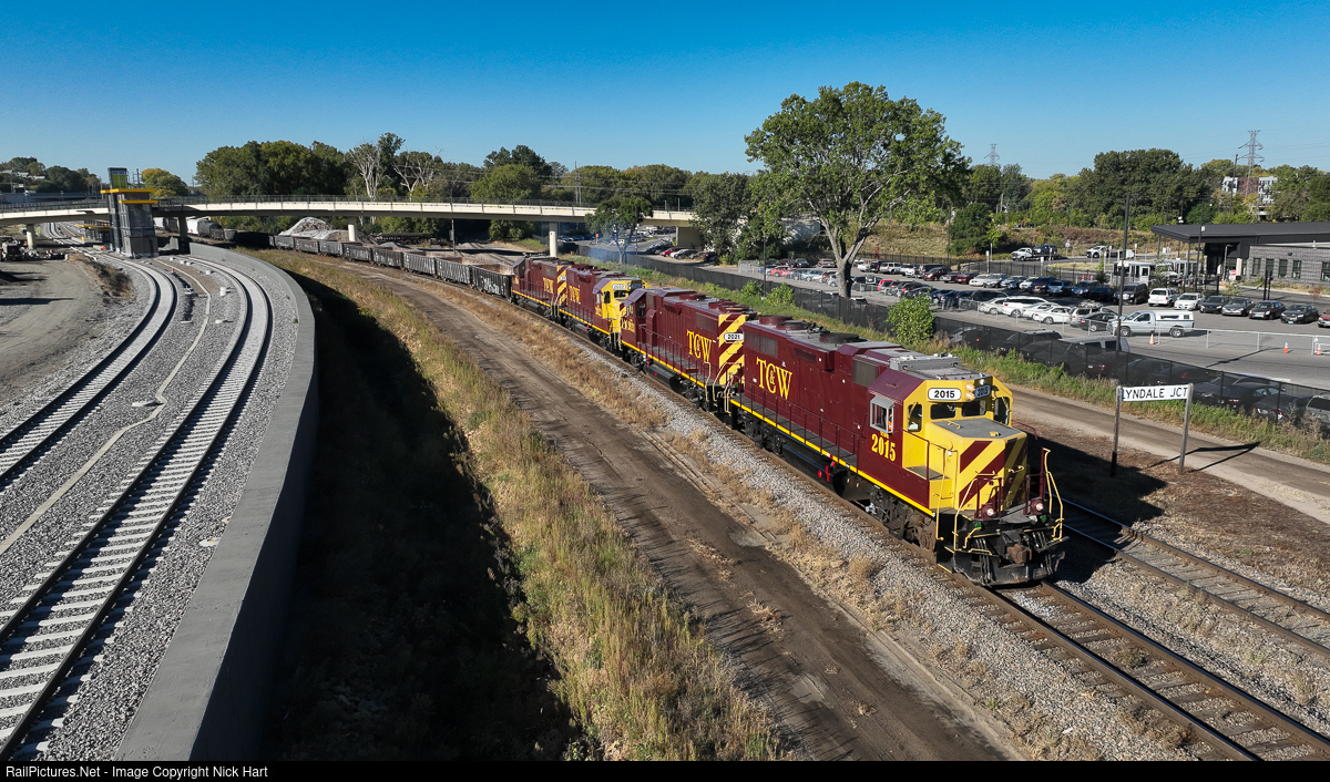 | TCW 2015, 2021, 2022 and 2014 make for a nice quad of Geeps as they pass Lyndale Junction in Minneapolis. The train is bound for interchange with the CPKC at Humboldt Yard. |