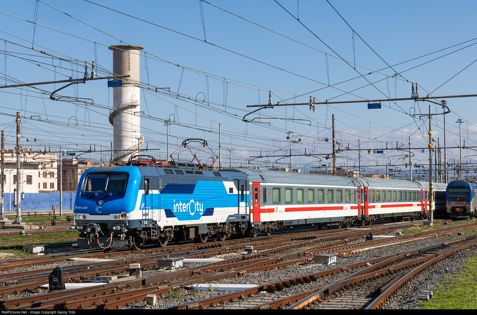 | Electrolocomotive E 464 # 252 of Trenitalia (only one cab) in the new white/light blue/blue paint scheme for the InterCity services is entering Roma Termini. Trenitalia has more then 700 hundreds of this type with 3000 kW and 160 km/h maximum velocity, built from 1999 to 2015. On the other end of this push-pull train was E 464 # 346 in the white/grey/red paint scheme. |