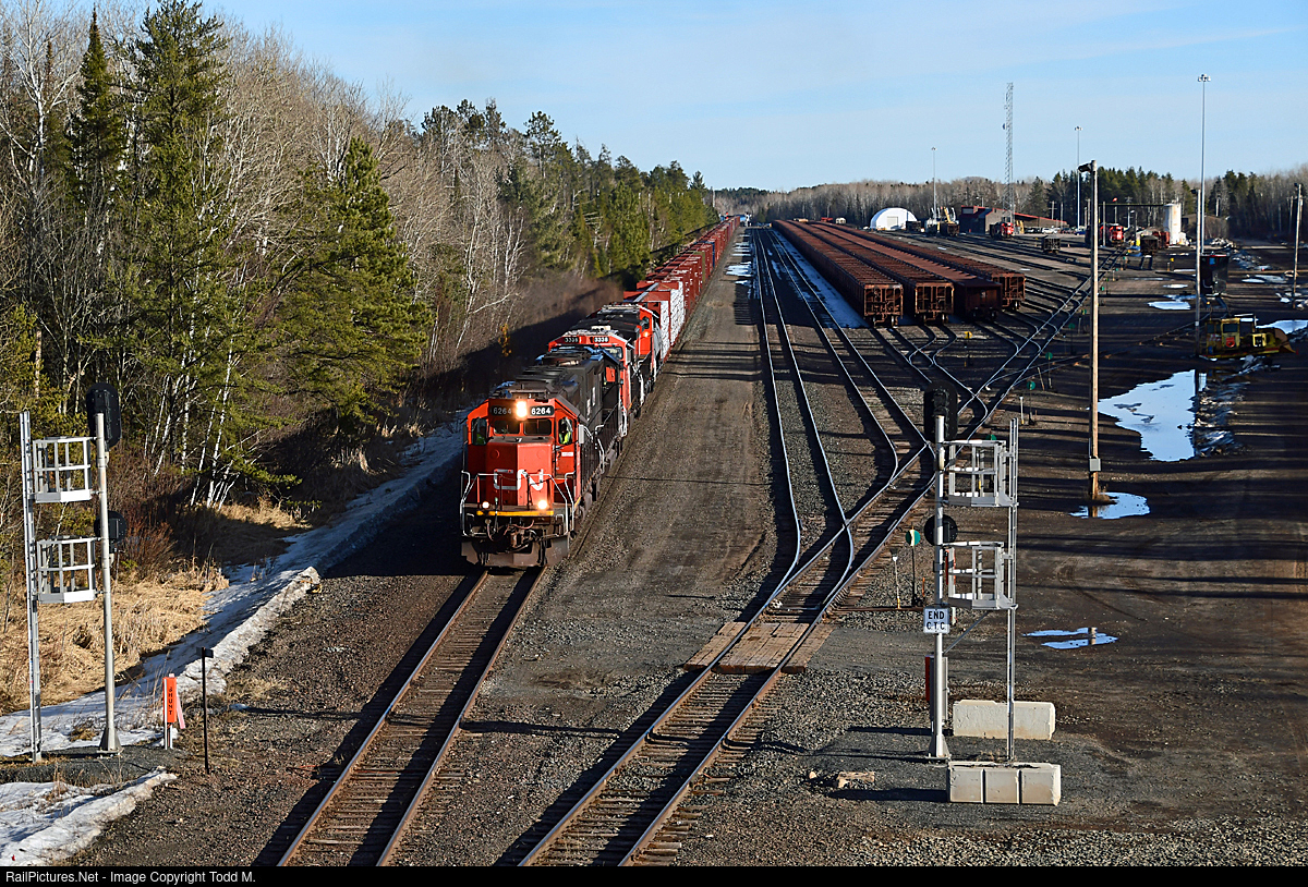 With one of its longest trains in a while, IC 6264 is pulling into CN's Keenan Yard with 7k feet of train trailing behind. Generally, this train brings up a few tank cars, a few loaded centerbeams, some bentonite clay hoppers along with any ore pool locomotives that need servicing at Proctor. Today's train had all that plus empty centerbeams that have been stored in the yard at Two Harbors.