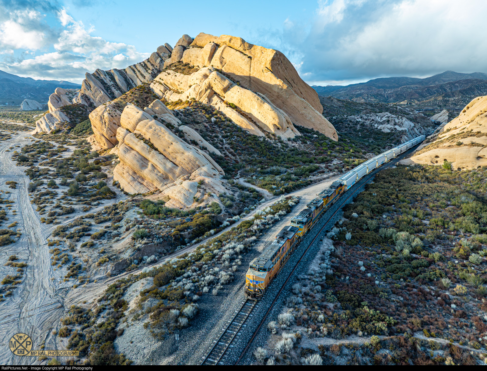 A UP manifest train passes through Mormon Rocks as it heads through the Cajon Pass on its way to Los Angeles.
