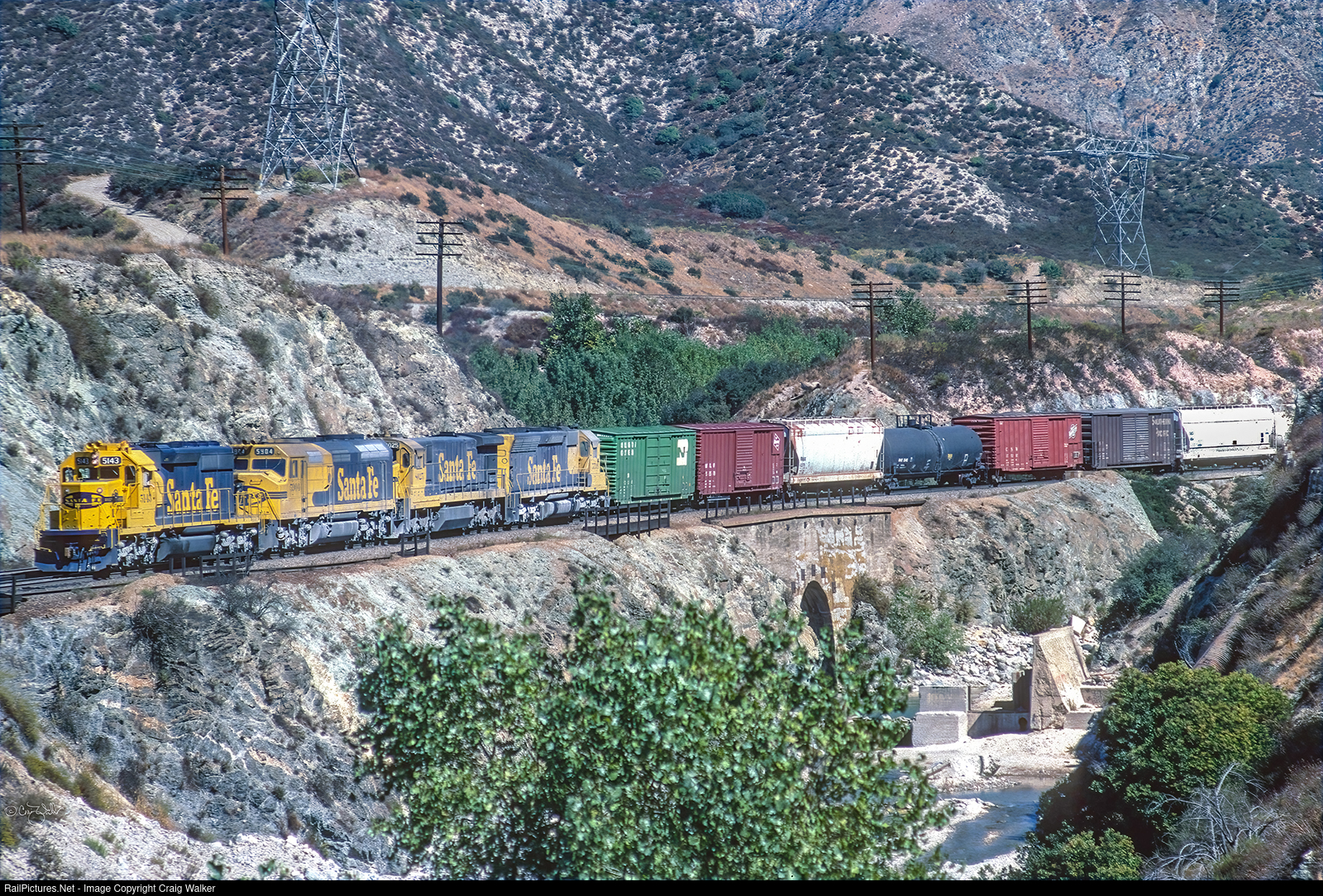 One-month-old Santa Fe Railway SD40-2 5143 leads a westbound freight through Blue Cut as it parallels Cajon Creek. Teamed with 5143 are F45 5904, C30-7 8025 and SD45 5599. (Cajon Pass, California – October 18, 1980)