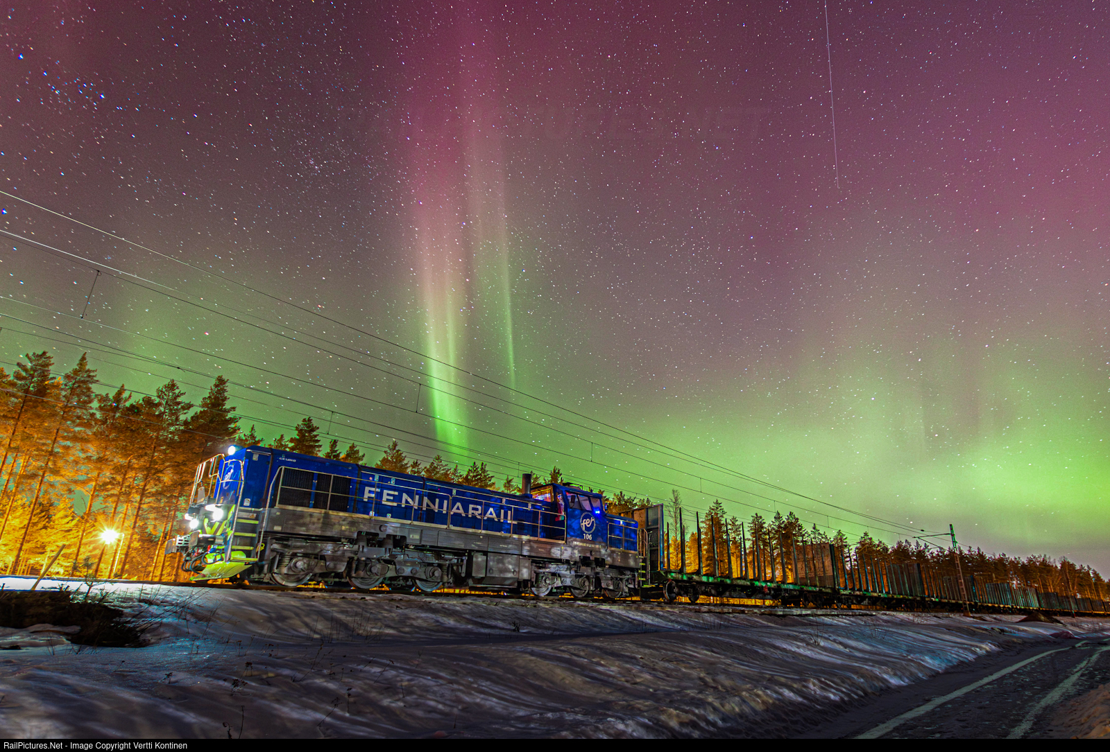 | Fenniarail freight train T 7125 with empty cars to Jämsänkoski for loading stops at Muurame to let two oncoming trains past on the single track line. Also on the scene is the beautiful lady aurora with different shades of green and red. |
