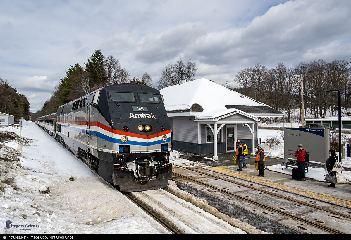 On February 24th, 2024, Amtrak P42DC #145, painted in Phase III heritage, leads southbound Vermonter Train 57 into the station at Claremont, New Hampshire on the New England Central Railroad (NECR) Palmer Subdivision. Originally built by the Boston and Maine Railroad in 1920, Claremont became New Hampshire's first Amtrak station since the "Montrealer" began stopping there in 1972. This service was replaced by the current "Vermonter" service in 1995.