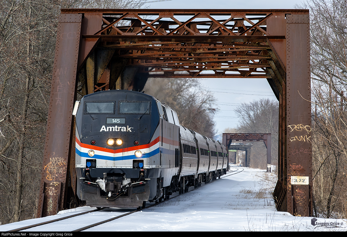 On February 24th, 2024, Amtrak P42DC #145, painted in Phase III heritage, leads southbound Vermonter Train 57 over the twin bridges over the Chicopee River in Chicopee, Massachusetts on the MassDOT Connecticut River Line.