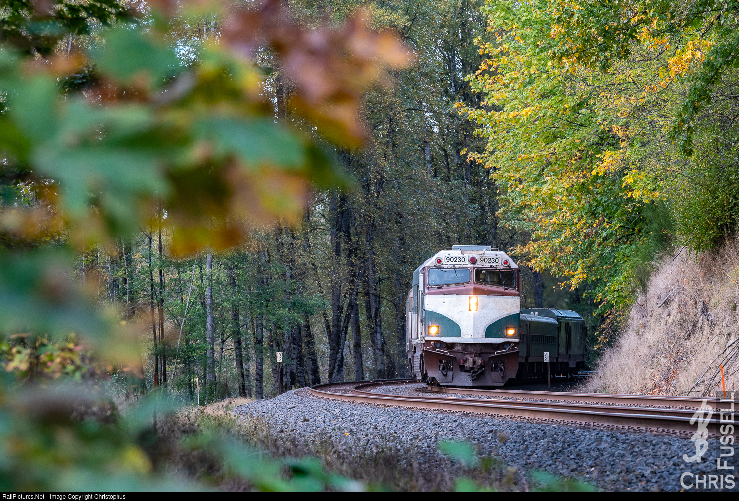 Amtrak F40 #230, now operating as a non-powered control unit numbered 90230, leads an Amtrak Cascades train equipped with Horizon cars through the Rivendell community north of Ostrander, WA. The Horizon cars have since been pulled from service, and there's no telling how long it will be until the Vancouver BC to Portland train #517 operates again.