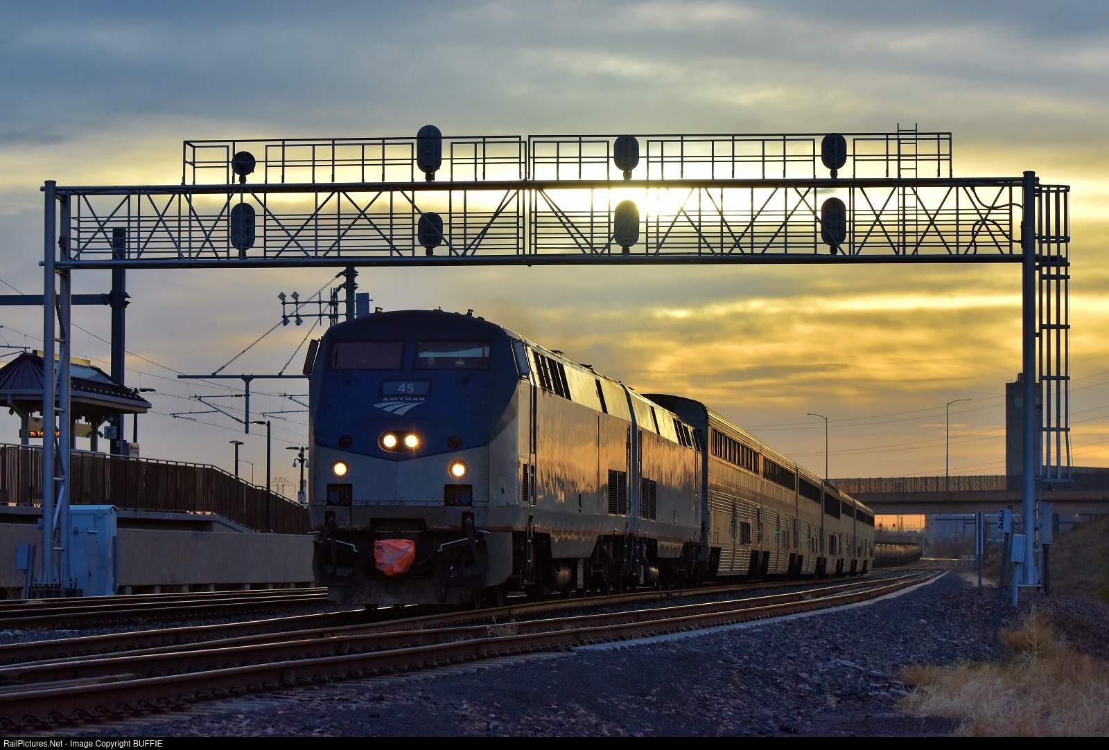 Amtrak engine #45 (P42DC) runs through the signal tower in Denver at sunrise as it heads west on the Moffat Tunnel Sub.